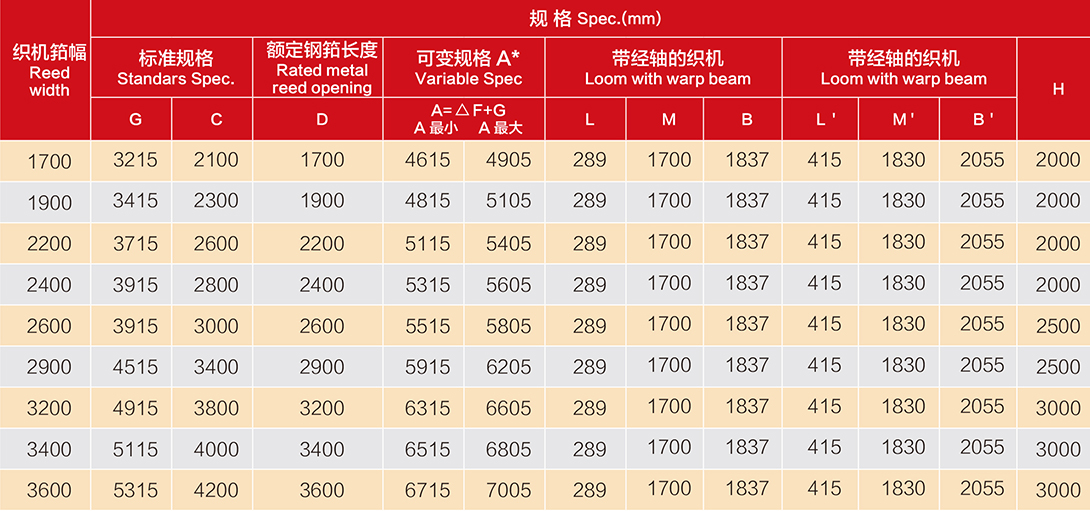 該機(jī)設(shè)計(jì)轉(zhuǎn)速700轉(zhuǎn)/分,最大入緯率1300米/分,筘幅范圍170~360厘米,不僅可織造各種服裝、裝飾面料,而且可織造輕型和中重型工業(yè)纖維和玻璃纖維。