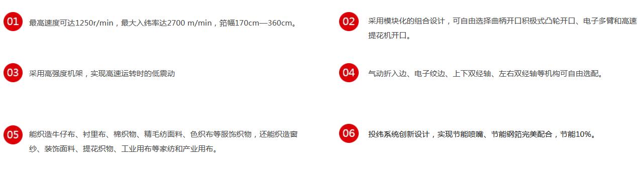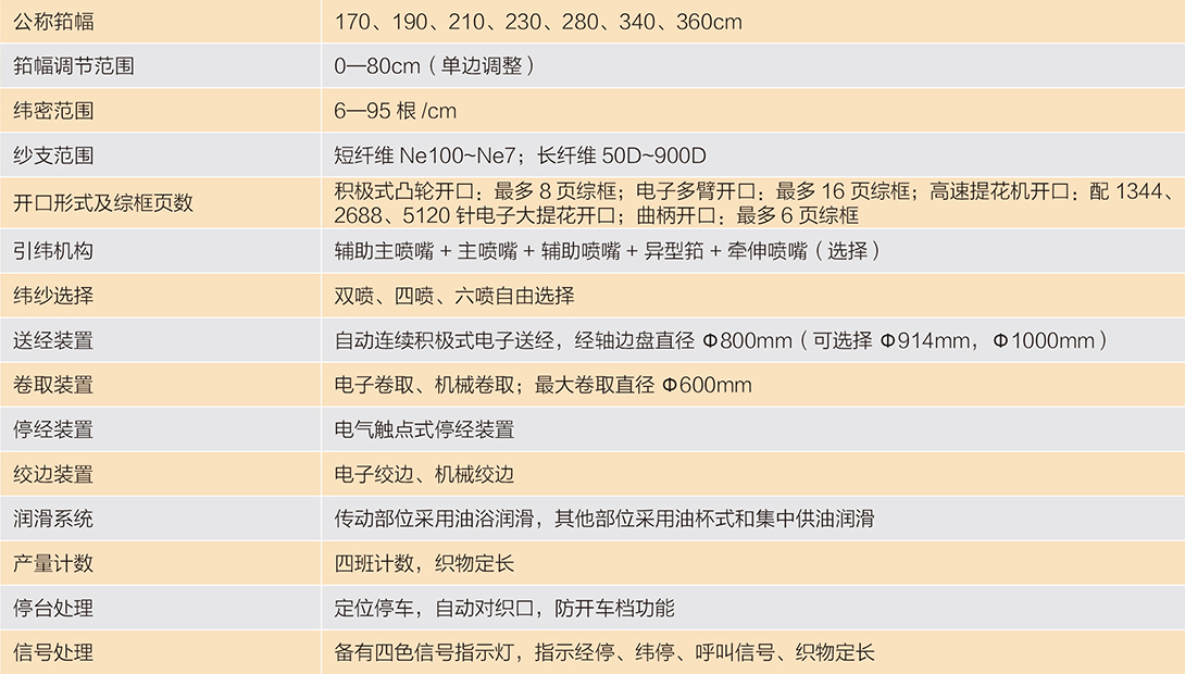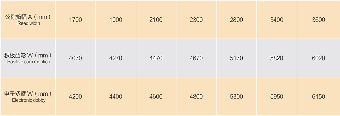 該機采用模塊組合式設計概念,高剛性的機架,加寬的箱型墻板,獨特的打緯平衡機構,精確的引緯控制技術,造就一款高速、低振動、節(jié)能和智能化的新型噴氣織機。